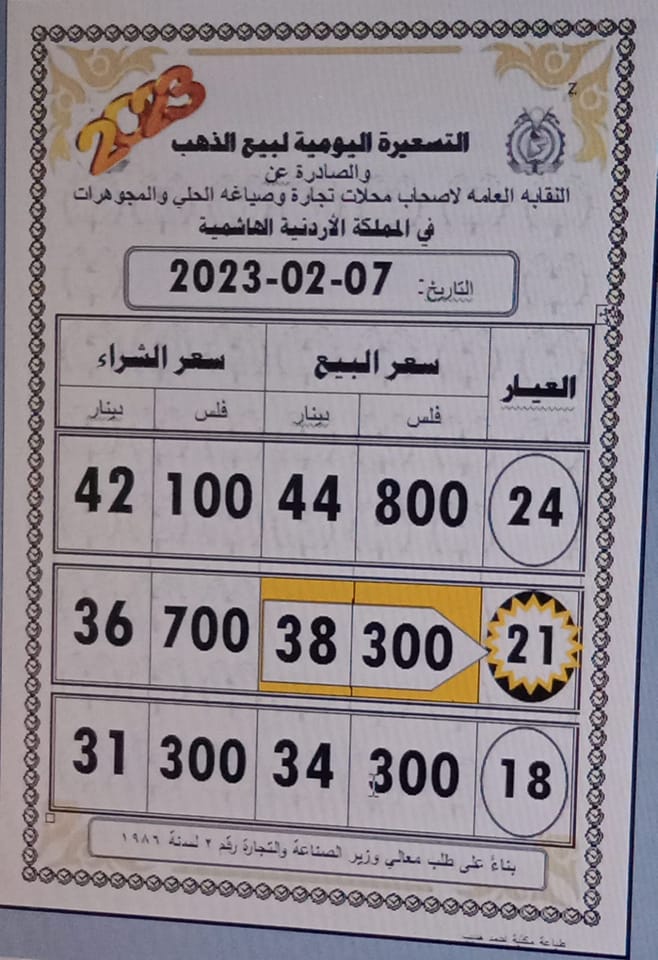 وبلغ سعر الذهب عيار 21 الأكثر طلبا من قبل الأردنيين 38.30 دينارا لجهة الشراء من المحلات و 36.70 دينارا لجهة البيع.