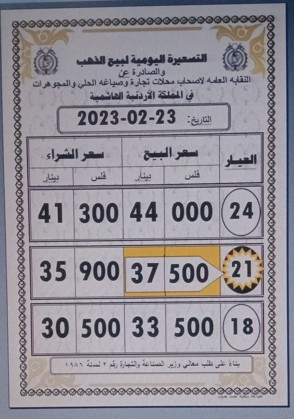 وبلغ سعر الذهب عيار 21 الأكثر طلبا من قبل الأردنيين 37.50 دينارا لجهة الشراء من المحلات و35.90 دينارا لجهة البيع.