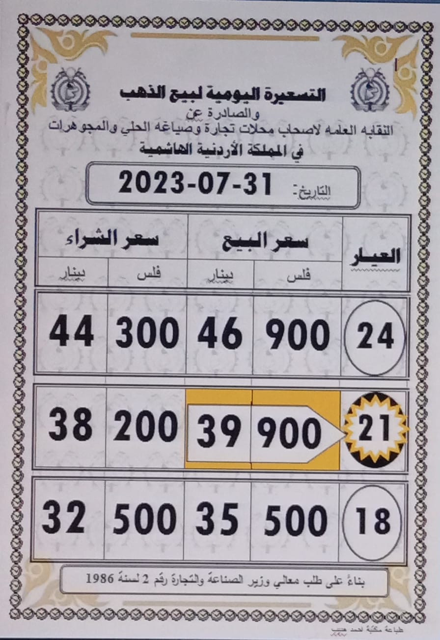وبلغ سعر غرام الذهب (عيار 21) الأكثر طلبا لدى الأردنيين 39،90 دينارا لجهة البيع، و 38.20 دينارا لجهة الشراء من المواطنين.