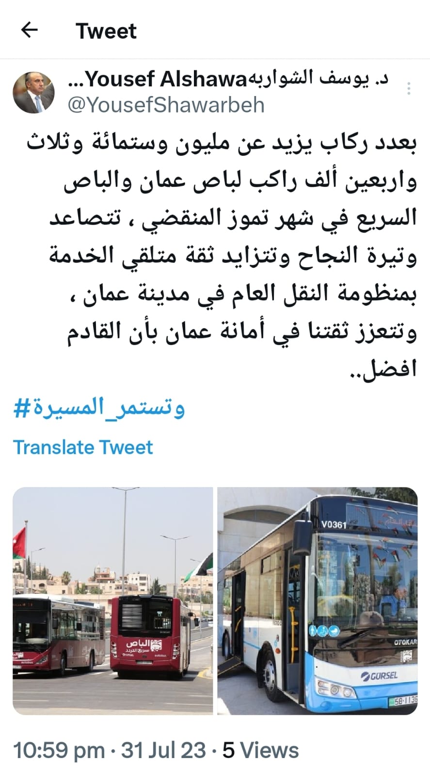 وقال الشواربة في تغريدة له عبر تويتر، "بعدد ركاب يزيد عن مليون وستمائة وثلاث وأربعين ألف راكب لباص عمان والباص السريع في شهر تموز المنقضي ، تتصاعد وتيرة النجاح وتتزايد ثقة متلقي الخدمة بمنظومة النقل العام في مدينة عمان ، وتتعزز ثقتنا في أمانة عمان بأن القادم افضل".