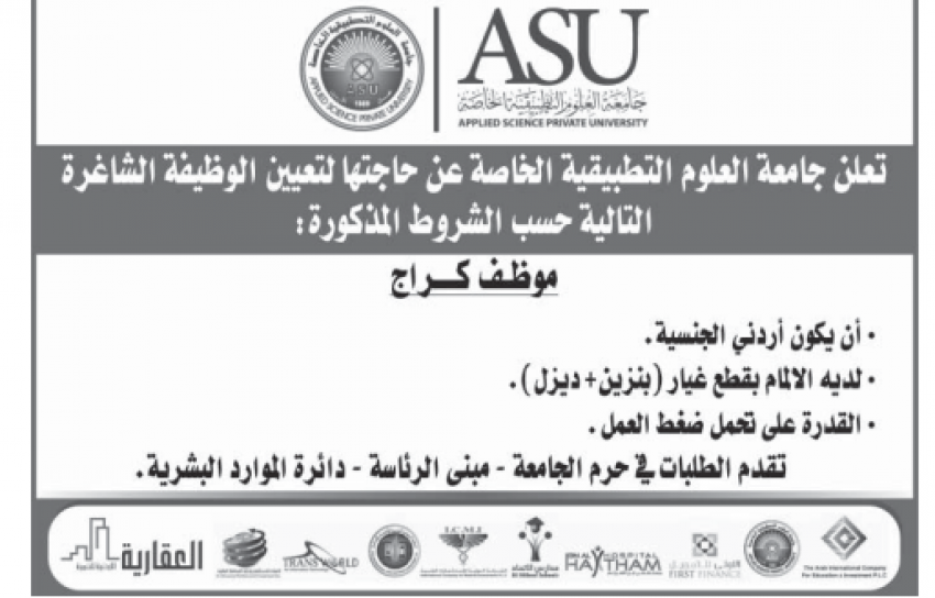 اعلنت جامعة العلوم التطبيقية الخاصة عن حاجتها لتعيين الوظيفة الشاغرة: