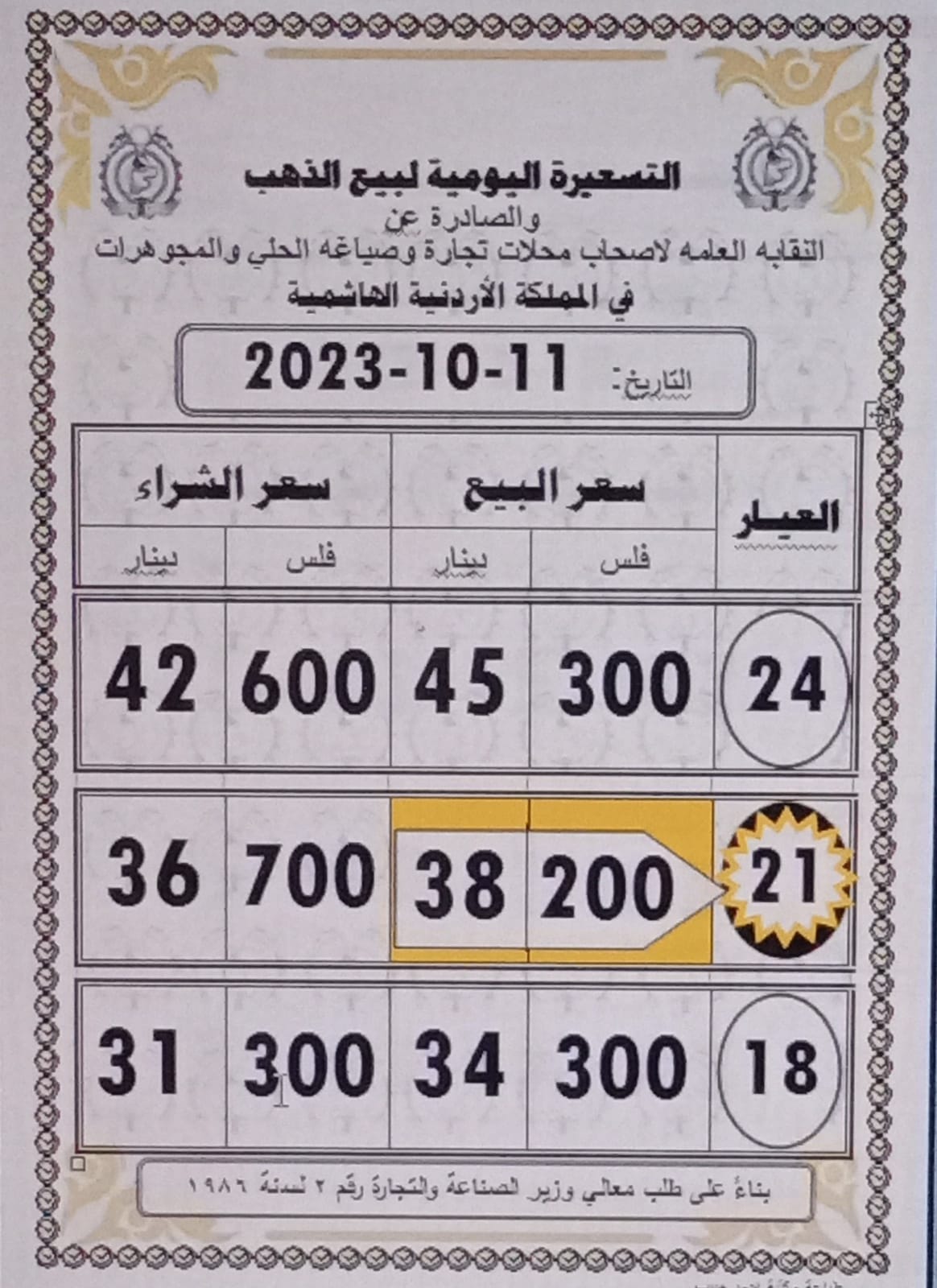 وكما بلغ سعر بيع جرام الذهب عياري 24 و18 لغايات الشراء من محلات الصاغة، 45.30 و 34.30 دينارا على التوالي.