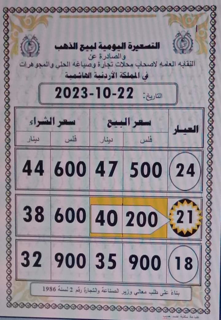استقرت اسعار الذهب في السوق المحلي اليوم، بحسب التسعيرة اليومية لنقابة العامة لأصحاب محلات تجارة وصياغة الحلي والمجوهرات.وبلغ سعر بيع غرام الذهب عيار 21 الأكثر رغبة من المواطنين في السوق المحلية، اليوم الأحد، 40.20 دينارا لغايات الشراء من محلات الصاغة، مقابل 38.60 دينارا لجهة البيع. وبلغ سعر بيع الغرام الواحد من الذهب عياري 24 و18 لغايات الشراء من محلات الصاغة، 47.50 و 35.90 دينارا على التوالي. |