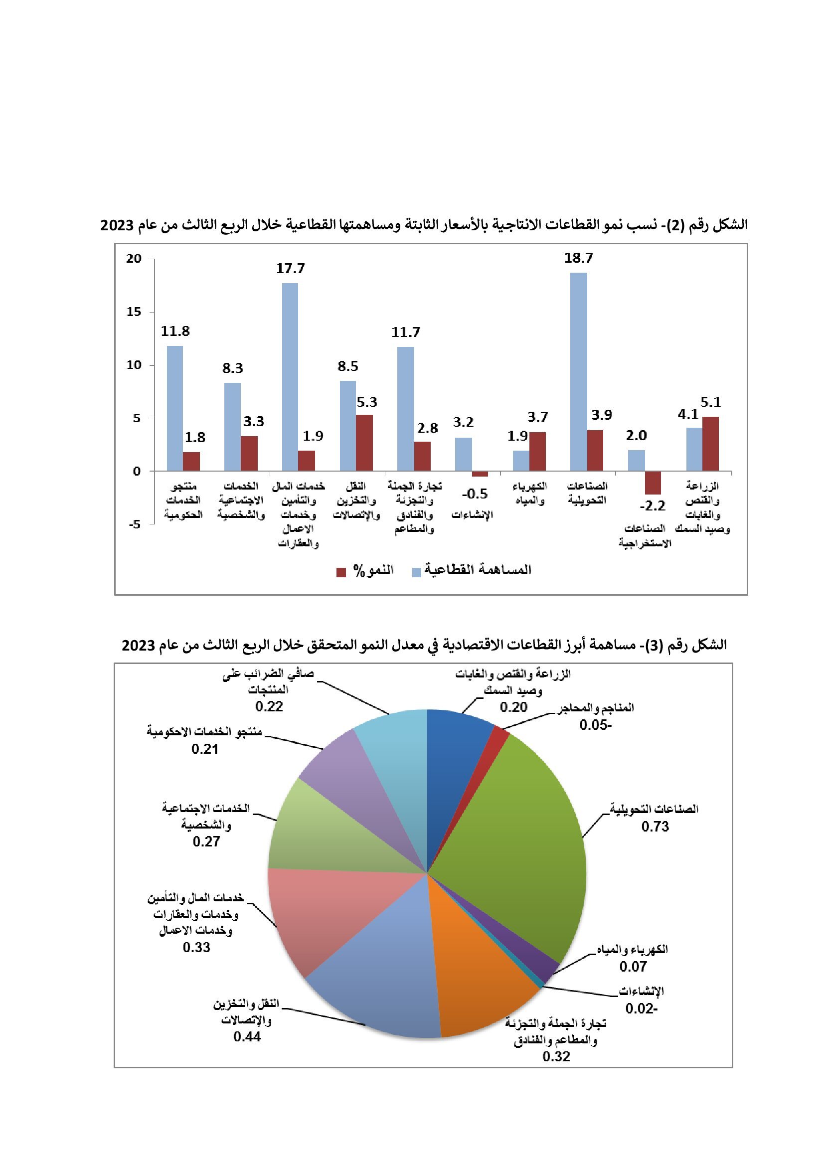 بالنسبة للتقديرات القطاعية فقد أظهرت النتائج الأولية أن غالبية القطاعات الاقتصادية قد حققت نمواً خلال الربع الثالث من عام 2023 مقارنة بالربع الثالث من عام 2022، حيث حقق "قطاع الفنادق والمطاعم" أعلى معدل نمو خلال هذه الفترة بلغت نسبته 6.3% مساهماً بمقدار 0.11 نقطة مئوية من معدل النمو المتحقق، تلاه "قطاع النقل والتخزين والإتصالات" بنسبة 5.3% مساهماً بمقدار 0.44 نقطة مئوية، ثم " قطاع الزراعة والقنص والغابات وصيد الأسماك " بنسبة نمو بلغت 5.1% وبمساهمة مقدارها 0.20 نقطة مئوية، ويليه "قطاع الصناعات التحويلية" بنسبة نمو بلغت 3.9% وبمساهمة مقدراها 0.73 نقطة مئوية من معدل النمو المتحقق.