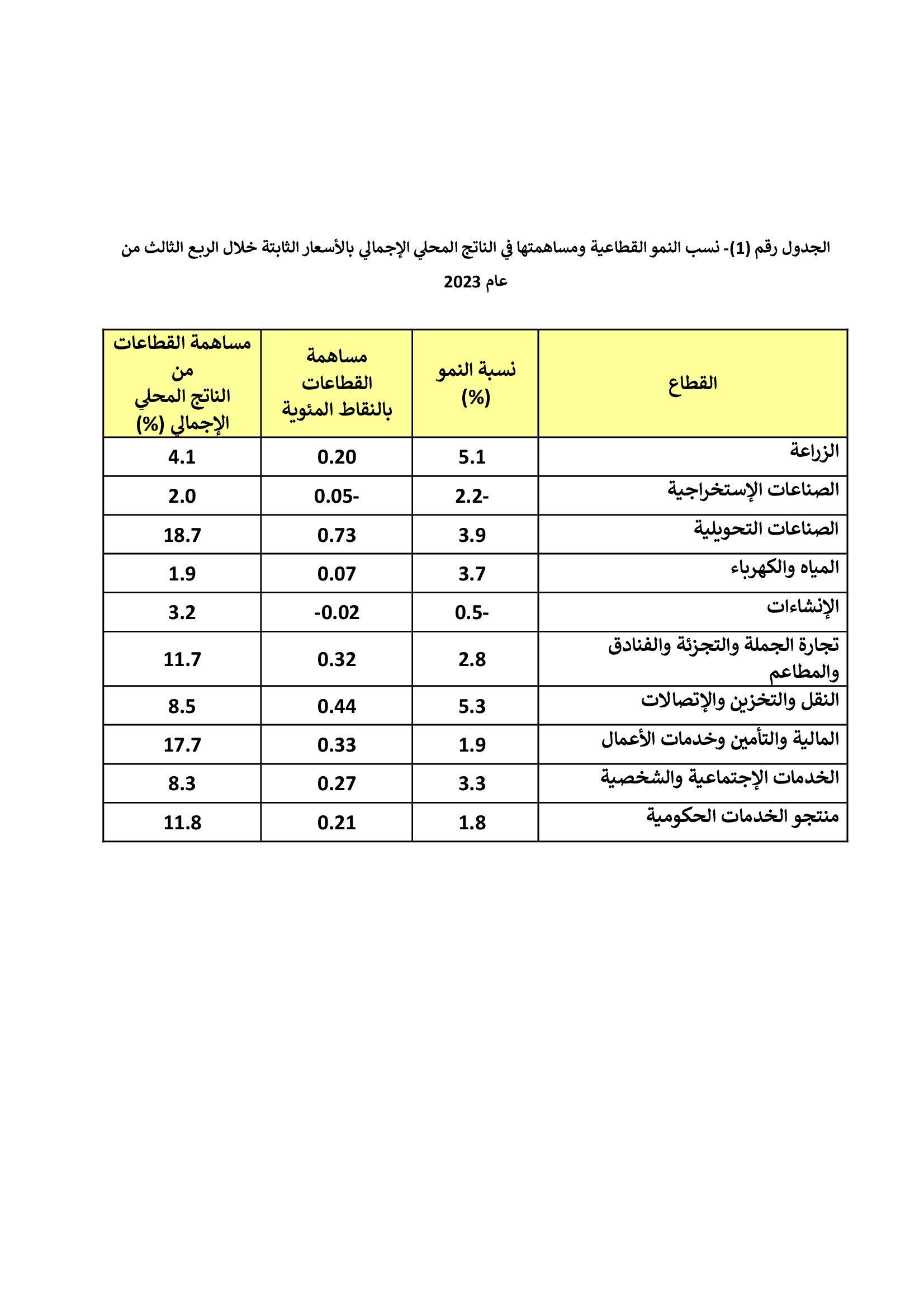 وبذلك تكون نسبة النمو للأشهر التسعة الأولى من عام 2023 قد بلغت 2.7% مقارنةً بالتسعة أشهر الأولى من عام 2022 بالأسعار الثابتة.