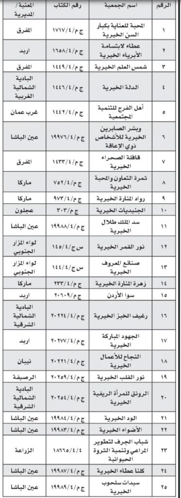 أعلنت وزارة التنمية الاجتماعية، اليوم، حلّ عددد من الجمعيات الخيرية في المملكة.جاء ذلك استناداً لأحكام المادة 11/ب من النظام المحدد لأحكام الأنظمة الأساسية للجمعيات رقم 57 لسنة 2010.ودعت وزارة التنمية، الدائنين والمدينين الذين لهم حقوق أو عليهم التزامات للجمعيات أناه مراجعة لجنة حلّ الجمعية المبينة إزاء كل جمعية خلال شهر من تاريخه.وتالياً أسماء الجمعيات المُنحلة