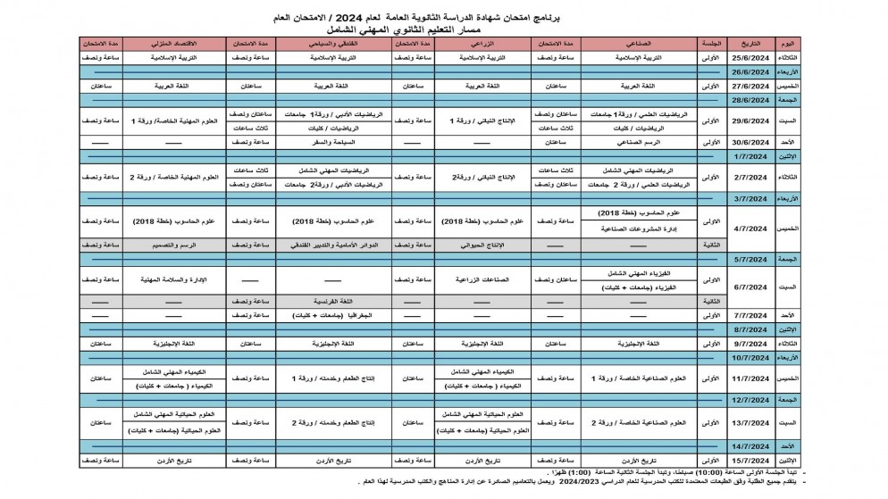 أعلنت وزارة التربية والتعليم اليوم الثلاثاء، جدول امتحان شهادة الدراسة الثانوية العامة لعام 2024 / الامتحان العام.