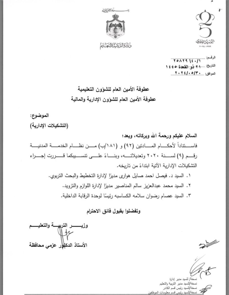 قرر وزير التربية والتعليم الدكتور عزمي محافظة اليوم الخميس إجراء تشكيلات إدارية لكبار الموظفي في الوزارة، بالإضافة إلى إحالة عدد من الموظفين إلى التقاعد.
