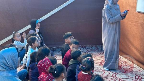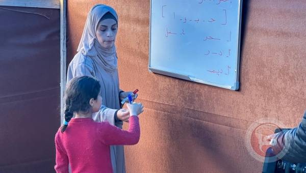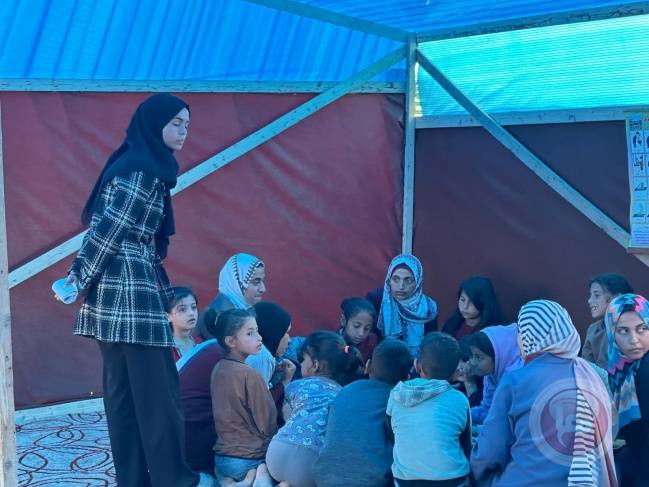 داخل خيام النزوح تقوم معلمات فلسطينيات بتجميع الأطفال تحت سن ال 12 سنة وتقديم بعض الحصص الدراسية في خيام لمواد العربي والرياضيات.