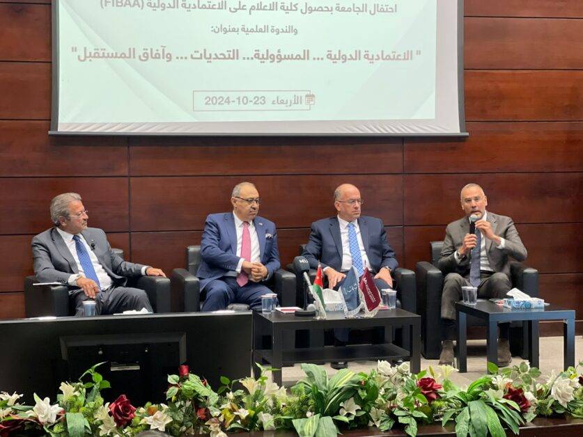 جاء ذلك خلال ندوة عقدت اليوم الأربعاء في حرم الجامعة بمناسبة حصول كلية الإعلام فيها على الاعتمادية الدولية من الهيئة الألمانية لتقييم برامج التعليم العالي (FIBAA).