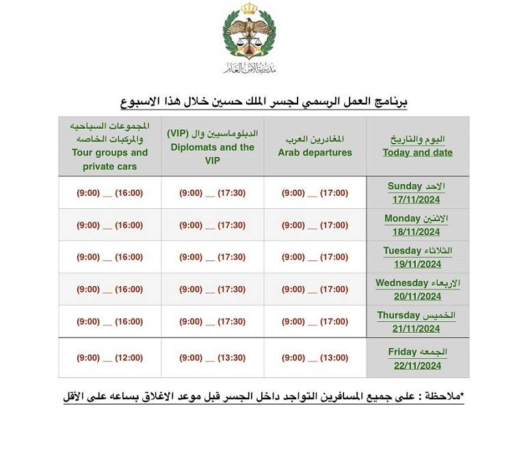 أعلنت إدارة أمن الجسور، أوقات عمل جسر الملك حسين، خلال هذا الأسبوع، من صباح اليوم الأحد الموافق 17/11/2024، ولغاية يوم الخميس الموافق 22/11/2024.