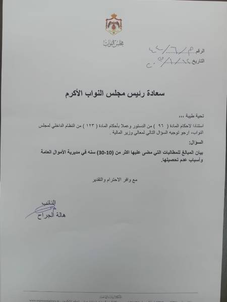 استنادا لأحكام المادة (96) من الدستور وعملا بأحكام المادة (123) من النظام الداخلي لمجلس النواب ارجو توجيه الأسئلة التالية إلى معالي رئيس الوزراء، ووزير المالية.