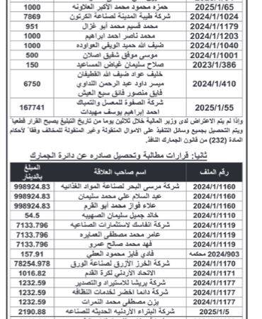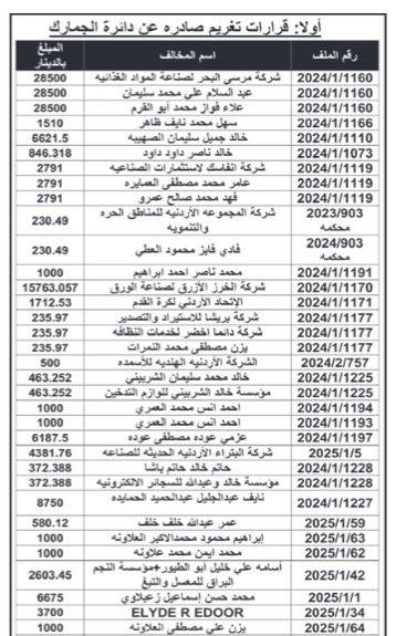 أعلنت دائرة الجمارك الأردنية، اليوم الخميس ، قرارات تغريم ومطالبة وتحصيل صادرة بحق عدة أشخاص وشركات.