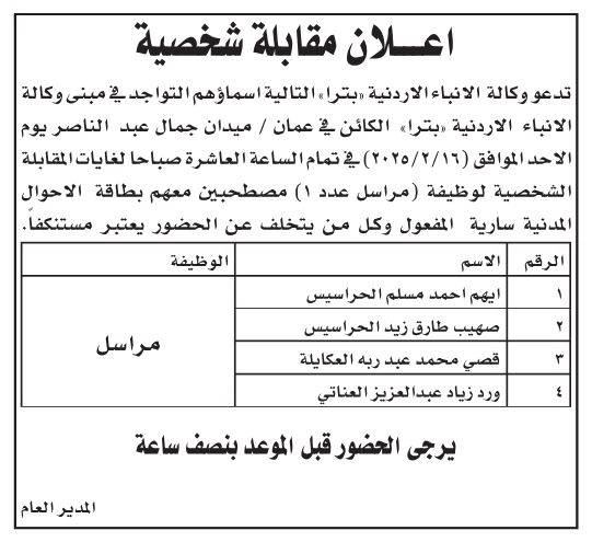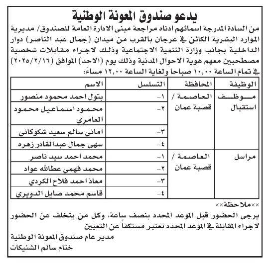أعلنت عدداً من المؤسسات الرسمية، اليوم الأحد، عن حاجتهم لتعبئة وظائف شاغرة، فيما دعت عدد من المرشحين لاسكتمال اجراءات التعيين.