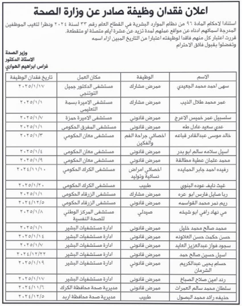 أعلنت وزارة الصحة ،اليوم الأحد، التالية أسماؤهم فاقدين لوظائفهم بحسب التواريخ المبينة أدناه نظرا لتغيبهم عن مواقع عملهم لمدة تزيد على عشرة أيام متصلة أو متقطعة، واستنادا لأحكام نظام الموارد البشرية في القطاع العام.