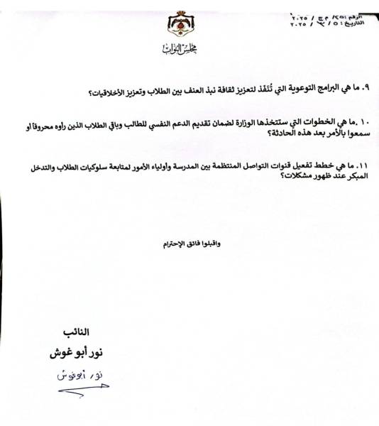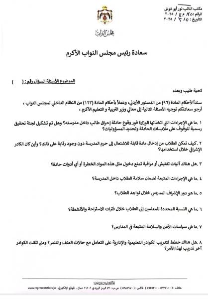 توجهت النائب نور أبو غوش بسؤالاً نيابياً لمعالي وزير التربية والتعليم والتعليم العالي حول حادثة حرق طفل داخل مدرسته في محافظة الزرقاء، وكيف تمكن الطلاب من إحضار مادة البنزين إلى المدرسة، وهل هناك آليات لضمان سلامة الطلاب في مدارسهم.
