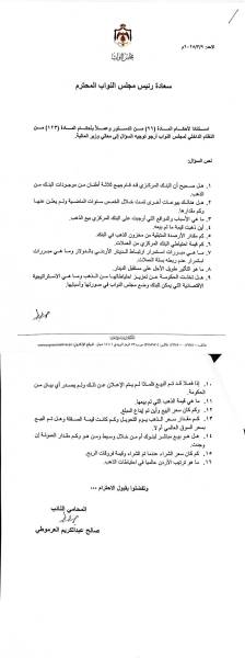 وسأل العرموطي عن الأسباب والدوافع التي أوجبت على البنك المركزي بيع الذهب، ومصير قيمة ما تمّ بيعه، ومقدار الأرصدة المتبقية من مخزون الذهب في البنك، وقيمة احتياطي البنك المركزي من العملات.