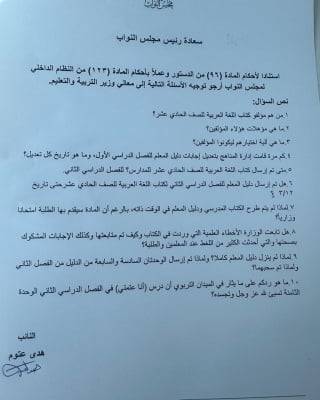 قدمت النائب هدى العتوم استفسارات لوزير التربية والتعليم حول كتاب اللغة العربية للصف الحادي عشر، متسائلة عن هوية مؤلفي الكتاب ومؤهلاتهم، وآلية اختيارهم، وأسباب تأخر تعديل دليل المعلم وإرساله للمدارس.
