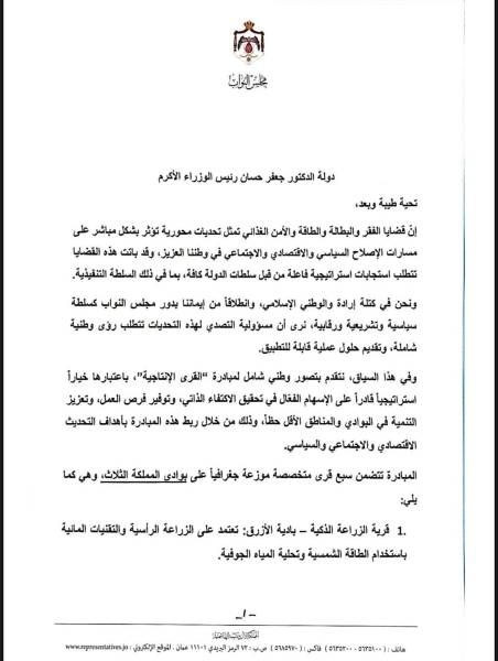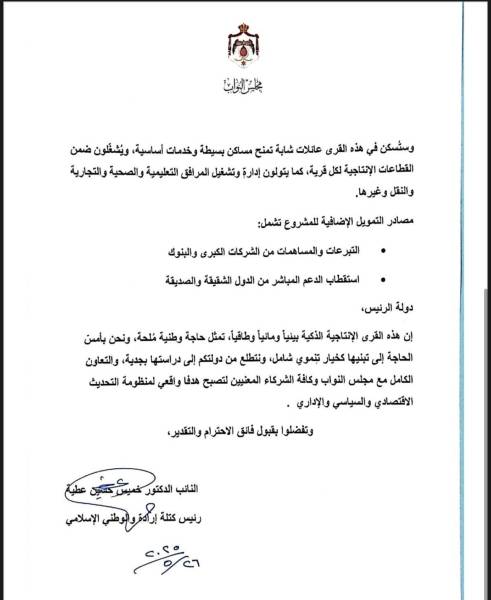 تقدم رئيس كتلة إرادة والوطني الإسلامي في مجلس النواب، النائب الدكتور خميس حسين عطية، بمبادرة وطنية شاملة بعنوان "القرى الإنتاجية”، تهدف إلى التصدي لتحديات الفقر والبطالة والطاقة والأمن الغذائي، من خلال إنشاء مجتمعات إنتاجية متكاملة في مناطق البوادي والمناطق الأقل حظاً في المملكة.