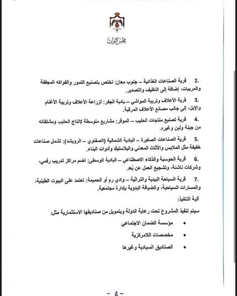 1.قرية الزراعة الذكية – بادية الأزرق: تعتمد على الزراعة الرأسية والتقنيات الحديثة باستخدام الطاقة الشمسية وتحلية المياه.
