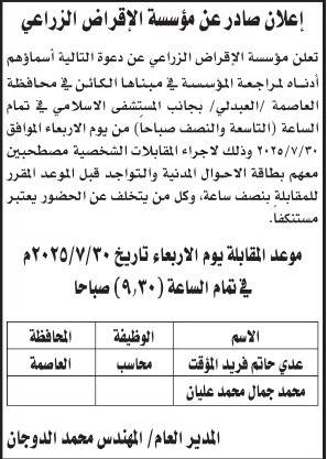 كما دعت مؤسسة الاقراض الزراعي التالية أسماؤهم لاجراء المقابلة الشخصية.