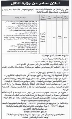 أعلنت وزارة النقل عن حاجتها لشراء خدمات مبرمج بموجب عقد لمدة سنة واحدة.