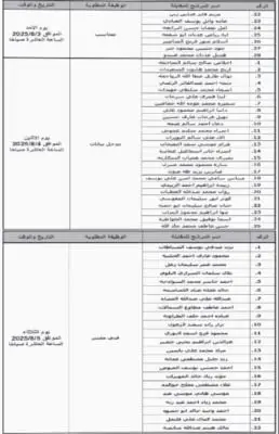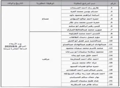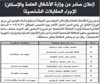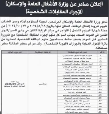 كما دعت وزارة الاشغال العامة والاسكان التالية اسماؤهم التواجد في مبنى الوزارة يوم الخميس 31 / 7 / 2025 لإجراء المقابلة الشخصية:
