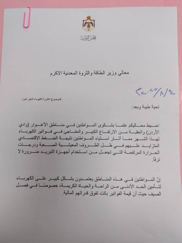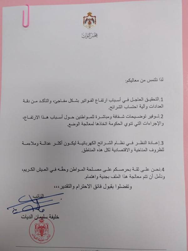 وجّه النائب خليفة سليمان الديات كتابًا رسميًا إلى وزير الطاقة والثروة المعدنية، طالب فيه بفتح تحقيق عاجل في أسباب الارتفاع المفاجئ على فواتير الكهرباء، لا سيما في مناطق الأغوار (وادي الأردن) والعقبة، والتي شهدت شكاوى متزايدة من المواطنين نتيجة الفواتير المرتفعة.