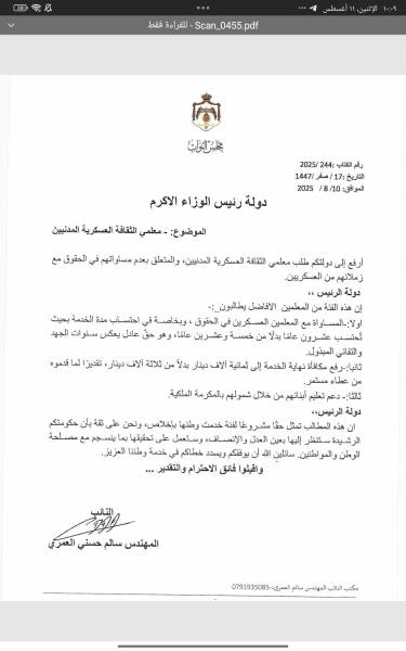 وأوضح العمري في مذكرته أن مطالب هذه الفئة تتضمن ثلاثة محاور رئيسية؛ أولها المساواة مع المعلمين العسكريين في احتساب مدة الخدمة، بحيث تُحتسب لهم 25 عاماً بدلاً من 35 عاماً للتقاعد، بما يعكس سنوات الجهد والعطاء المبذولة. أما المطلب الثاني فيتمثل برفع مكافأة نهاية الخدمة إلى ثلاثة آلاف دينار بدلاً من ألف دينار، تقديراً لما قدموه من خدمات، فيما دعا في المطلب الثالث إلى دعم تعليم أبنائهم من خلال شمولهم بالمكرمة الملكية.