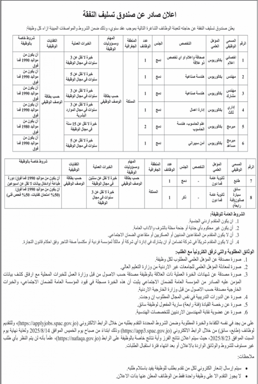 أعلن صندوق تسليف النفقة عن وظائف شاغرة بموجب عقد سنوي وضمن الشروط المبينة في الجدول ادناه.