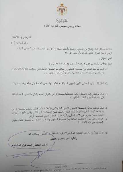وجّه النائب إسماعيل المشاقبة سؤالاً نيابياً إلى رئيس الوزراء، طالب فيه بتوضيحات مفصّلة حول آلية عقد الاتفاقيات بين صحيفة الدستور، التي يساهم في رأسمالها الضمان الاجتماعي، ومكتب الغد للإعلان، رغم تراكم ذمم مالية سابقة على المكتب تُقدّر بمليون دينار.