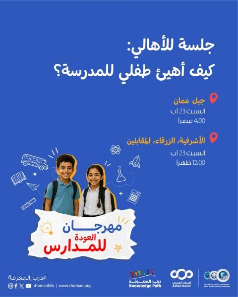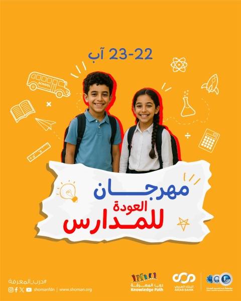 تنظم مكتبة "درب المعرفة" في مؤسسة عبد الحميد شومان، يوم بعد غد الجمعة، مهرجانًا خاصًا بعنوان "مهرجان العودة إلى المدارس"، وذلك في أفرع المؤسسة بجبل عمان، والأشرفية، والمقابلين، والزرقاء، وفرع جامعة الحسين التقنية.