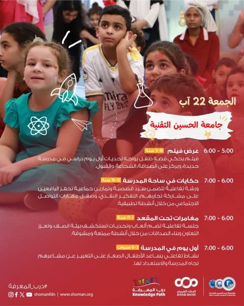 وبينت أبو عيشة أن برنامج الفعاليات يشتمل على عروض سينمائية موجهة للأطفال واليافعين تحاكي أجواء المدرسة وتعرض قصصًا عن التحديات والنجاحات في اليوم الدراسي الأول، وجلسات تفاعلية للأطفال بألعاب تعليمية ممتعة تساعدهم على التعبير عن مشاعرهم وتعزز ثقتهم بأنفسهم، وأنشطة جماعية للشباب واليافعين تهدف إلى تقوية مهارات الحوار والتفكير النقدي والإبداع، كذلك استضافة كاتبة أردنية لتقديم قراءة قصصية وحوار تفاعلي مع الأطفال حول كتاباتها، وتشجيعهم على المطالعة، إضافة إلى جلسات موجهة للأهالي بعنوان: "كيف أهيئ طفلي للمدرسة؟" يقدمها مجموعة من المختصين في التربية والإرشاد النفسي، بهدف تزويد الأهل بنصائح عملية لدعم أطفالهم في بداية العام الدراسي.