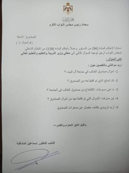وأكد النائب المشاقبة أن الهدف من السؤال النيابي هو تعزيز الشفافية وضمان توجيه أموال الطلبة في جامعة آل البيت نحو الغايات التي أُنشئ الصندوق من أجلها، مشدداً على ضرورة أن تكون كل الإجراءات واضحة أمام الطلبة وأولياء أمورهم.