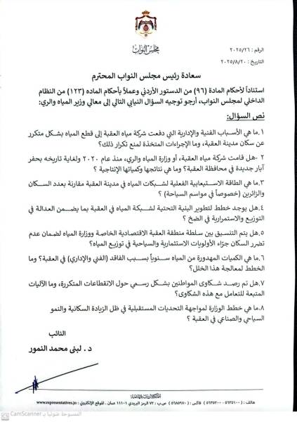 وطلبت النائب توضيح الطاقة الاستيعابية الفعلية لشبكات المياه في مدينة العقبة مقارنة بعدد السكان والزائرين، ولا سيما في مواسم السياحة، إضافة إلى بيان ما إذا كانت هناك خطط لتطوير البنية التحتية بما يضمن العدالة في التوزيع والاستمرارية في الضخ.