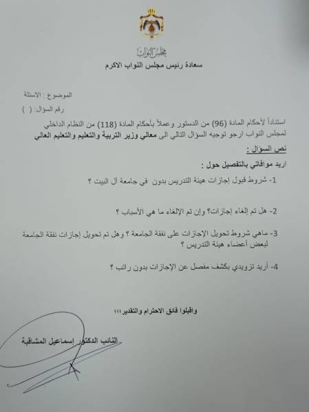 قدّم النائب الدكتور إسماعيل المشاقبة سؤالاً نيابياً إلى وزير التربية والتعليم والتعليم العالي، طالب فيه بإجابات مفصلة وموثقة حول ملف الإجازات الممنوحة لأعضاء هيئة التدريس في جامعة آل البيت، وما يثار حولها من إلغاء أو تحويل على نفقة الجامعة.