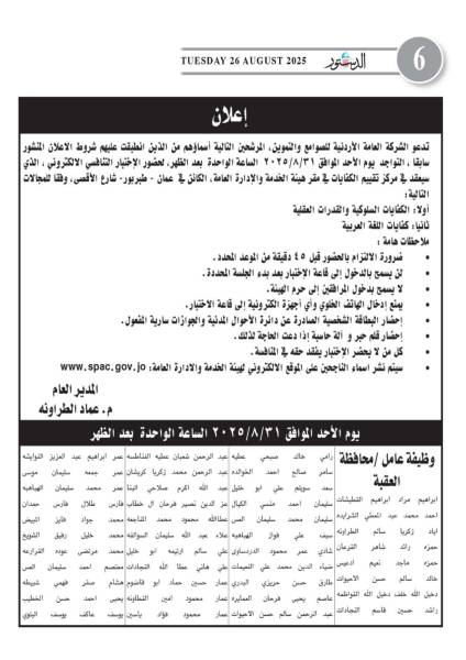 تدعو تنظيم هئية الطاقة والمعادن ، الشركة العامة الاردنية للصوامع والتموين ، ، المرشحين التالية أسماؤهم، لحضور الامتحان التنافسي الالكتروني، الذي سيعقد في مركز تقييم الكفايات في مقر هيئة الخدمة والإدارة العامة، الكائن في طبربور - شارع الأقصى.