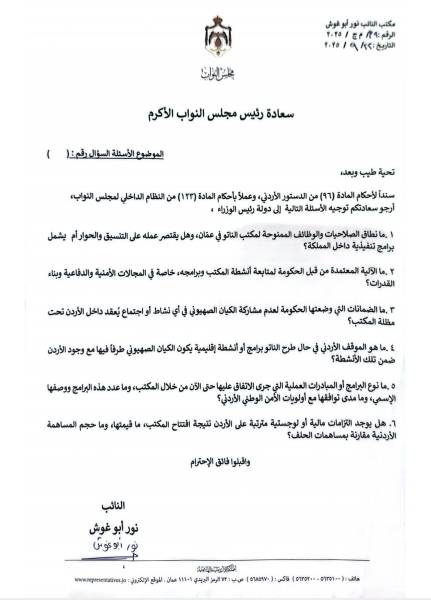 كما استفسرت النائب عن الضمانات الحكومية لمنع مشاركة الكيان الصهيوني في أي نشاط أو اجتماع يُعقد داخل الأردن تحت مظلة المكتب، وعن الموقف الأردني في حال طرح الناتو برامج أو أنشطة إقليمية يشارك فيها الاحتلال الإسرائيلي.