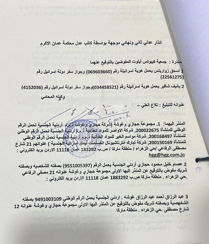 قرر مجلس نقابة المحامين الأردنية بالإجماع شطب أحد المحامين المزاولين من سجلاتها، وذلك على خلفية تمثيله القانوني لسفارة الكيان الإسرائيلي.وأوضح القرار أن المحامي المشطوب كان قد أرسل مؤخراً إنذاراً عدلياً باسم السفارة إلى عدد من الشركات الأردنية، ويأتي هذا القرار في إطار التزام النقابة بمبادئها وقيمها الرافضة للتطبيع مع الكيان الإسرائيلي.