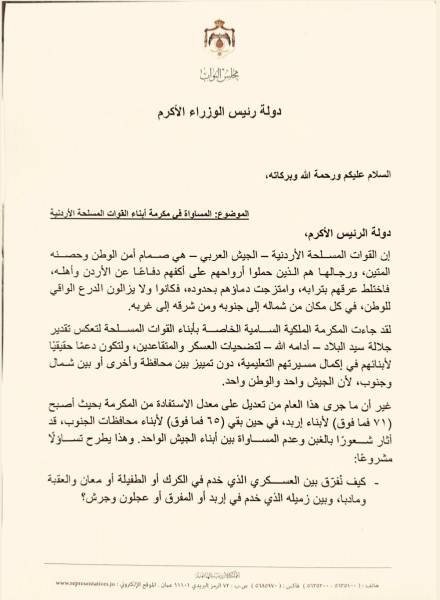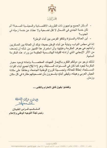وأكد القبلان في مذكرته أن القوات المسلحة الأردنية – الجيش العربي – هي صمام أمان الوطن وحصنه المنيع، وأن أبناءها الذين قدموا أرواحهم دفاعًا عن الأردن يستحقون العدالة والمساواة في التعليم ومواصلة مسيرتهم الأكاديمية، مشددًا على أن التمييز في النسب يثير شعورًا بعدم المساواة بين أبناء الجيش الواحد.