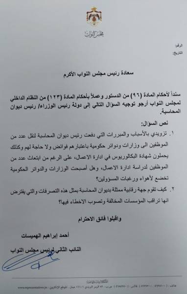 الهميسات طالب بتبرير الأسباب والمبررات التي دفعت رئيس ديوان المحاسبة لنقل موظفين من وزارات ودواوين حكومية إلى الديوان رغم عدم الحاجة لهم ووجود فائض، مؤكداً أن عدداً منهم لا يحملون سوى شهادة البكالوريوس في إدارة الأعمال في وقت يتخرّج فيه آلاف الأردنيين من التخصص ذاته دون فرصة عمل، متسائلاً: "هل تحوّلت الوزارات والدواوين الحكومية إلى ساحات لتصفية الأهواء وإرضاء رغبات المسؤولين؟”