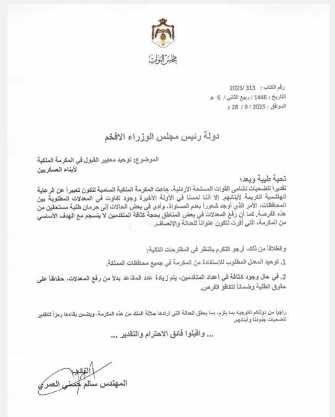 وأوضح العمري في سؤاله أن المكرمة الملكية السامية وُجدت لتكون عنواناً للرعاية الهاشمية الكريمة لأبناء الشهداء والعسكريين، إلا أن ما جرى في السنوات الأخيرة كشف عن تفاوت كبير في المعدلات المطلوبة بين المحافظات، الأمر الذي أدى إلى حرمان طلبة مستحقين من الاستفادة من هذه الفرصة، مقابل قبول آخرين بمعدلات أقل في بعض المناطق، وهو ما اعتبره لا ينسجم مع الهدف الأساسي من المكرمة.