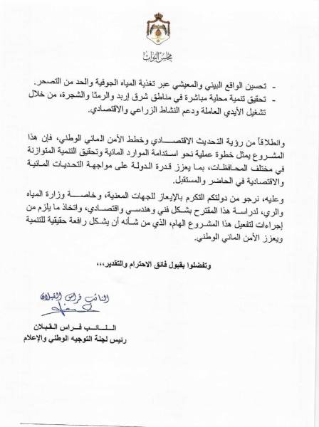 النائب فراس القبلان يرفع مقترحًا بإنشاء سد مائي في شرق المغير – غرب الرمثا – جنوب بلدة الشجرة