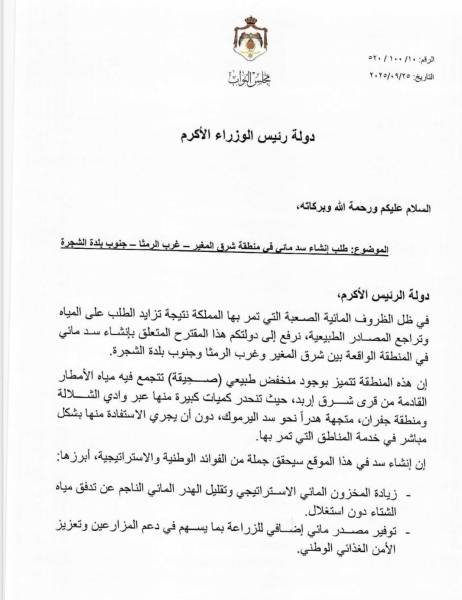 قدّم النائب فراس القبلان، رئيس لجنة التوجيه الوطني والإعلام في مجلس النواب، مقترحًا إلى دولة رئيس الوزراء لإنشاء سد مائي في منطقة شرق المغير – غرب الرمثا – جنوب بلدة الشجرة، وذلك في ظل التحديات المائية التي تواجهها المملكة نتيجة ازدياد الطلب على المياه وتراجع المصادر الطبيعية.