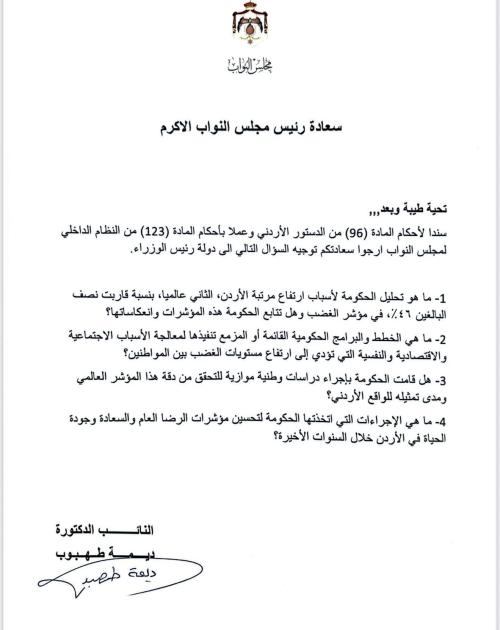 #عاجل..النائب طهبوب تستوضح أسباب ارتفاع مؤشر الغضب بالأردن
