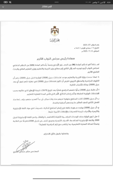 وختم النائب العمري سؤاله بالتأكيد على ضرورة أن تتناسب العملية التعليمية مع الظروف الواقعية والوقت المتاح، لضمان تحقيق العدالة وتكافؤ الفرص بين جميع الطلبة.