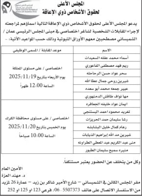 دعت وزارات ومؤسسات حكومية، اليوم الثلاثاء، التالية أسماؤهم لإجراء المقابلات الشخصية.