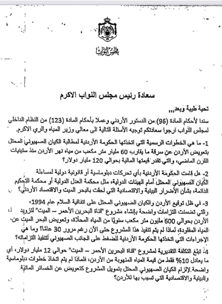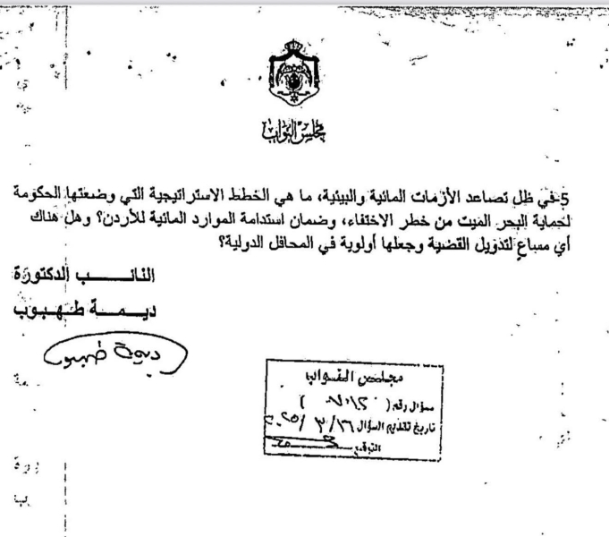 مرفق سؤالي المطول والمفصل عن ملف المياه وسرقات الكيان وعدم التزامه بالمشاريع المائية والاضرار التي لحقت بالبحر الميت والاقتصاد الأردني، وجواب الوزارة بطريقة البرقيات التي يدفع فيها ثمن الأحرف لارسالها دون أي معلومة قيمة!!!