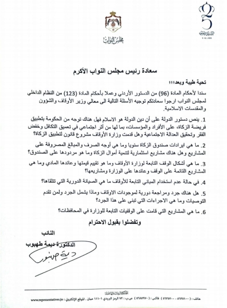 قالت النائب ديمة طهبوب إن ردّ وزير الأوقاف على السؤال النيابي الذي وجهته له حول "الزكاة والأوقاف" كشف عن "كنز مخفي” من الأصول الوقفية القابلة للاستثمار، والتي يمكن أن تسهم بشكل ملموس في زيادة إيرادات الخزينة ودعم ملفات اقتصادية واجتماعية ملحّة.