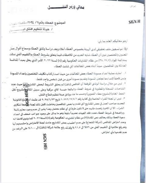مستهجناً بذات الوقت أن وزارة النقل لا زالت ترفض الامتثال لقرار هيئة النزاهة و مكافحة الفساد بخصوص العطاء رقم ١ / ٢٤ التابع لهيئة النقل البري "والقاضي برفض مخرجات لجنة الشراء والتوصية باعادة طرح العطاء" في حين تستمر لجنة الشراء بإجراءات الإحالة بمخالفة صريحة للقانون!.